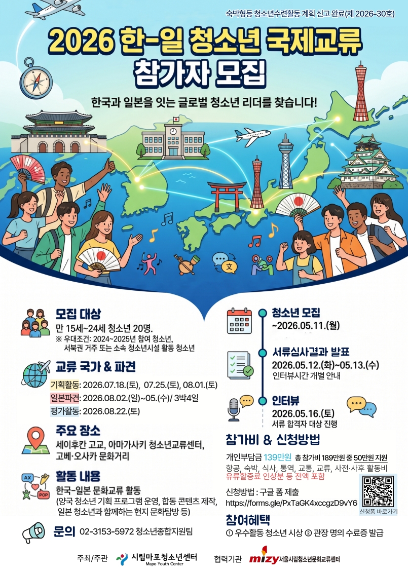 [홍보] 2026년 시립마포청소년센터 한국-일본 청소년 국제교류 프로그램 참가자 모집 홍보