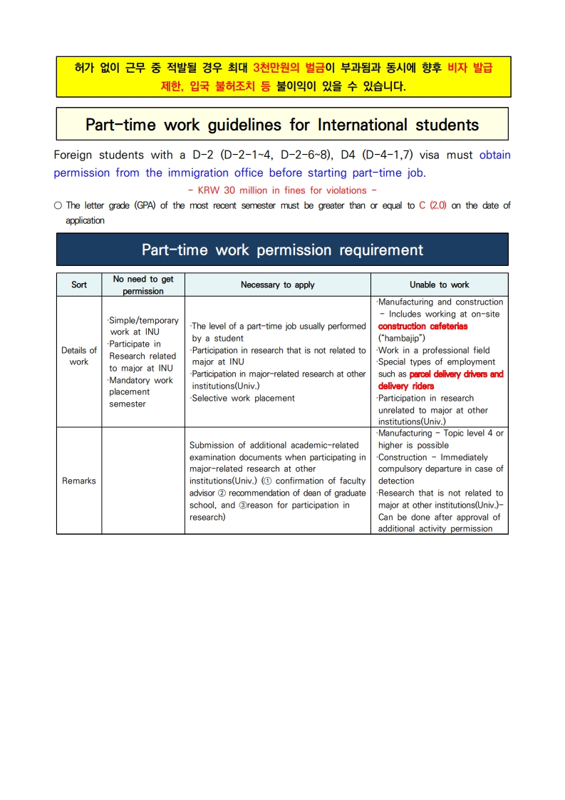fnctId=bbs,fnctNo=1840 [외국인 유학생 시간제취업 안내사항]Part-time work guidelines for International students NO 423182 Date 2026-04-22 Modify Date 2026-04-22 Writer 동북아국제통상물류학부 (032-835-8710, 8933) Count 233 Attachment 유학생 시간제취업 확인서 양식.hwp 학업 연계 심사 서류 양식.hwp 외국인 유학생 시간제취업 안내사항.pdf List