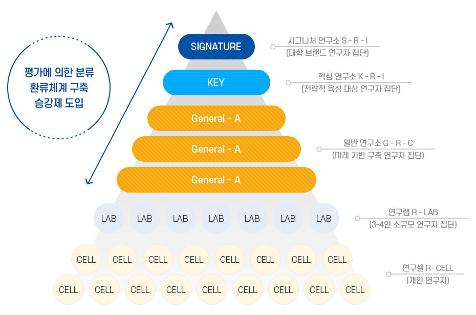 인천대학교는 연구 중심대학으로의 전환을 목표로, 대형과제 수주 실적 개선 및 연구성과의 질적 향상을 위해 우수 연구소에 소속된 연구그룹을 대상으로 연구과제를 지원하고 있습니다. 최대 100명의 전임교원이 10개의 연구 그룹에서 전문분야를 분담하여 다양한 주제의 연구를 진행함으로써 더 넓은 연구를 실현하고,연구결과를 바탕으로 다시 다양한 과제에 도전 및 수주함으로써 지속적인 연구의 선순환을 통한 더 깊은 연구를 실행하는 데에 목적을 두고 있습니다.