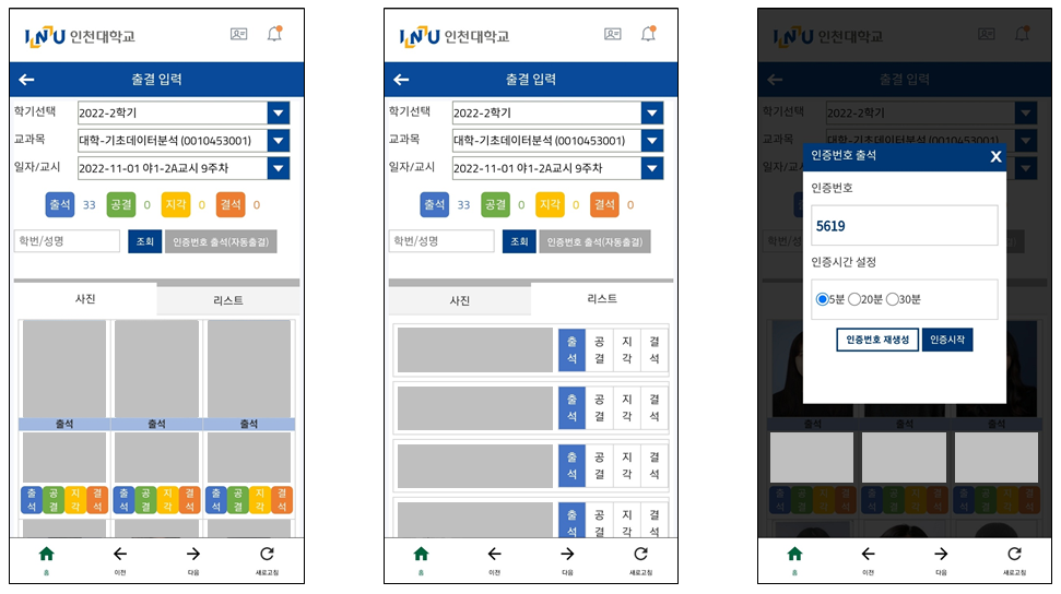 스마트캠퍼스 출결입력 메뉴에서 교시별로 호명(사진, 리스트 출결) 또는 자동출결(인증번호) 방법으로 출석 정보를 입력할 수 있습니다. 서비스 대상 교수 주요 기능 호명 출결 사진 및 리스트 방식 중 하나를 선택하여 출석 정보 수기 입력 자동 출결 (교수) 인증번호 생성 및 고지 → (학생) 인증번호 입력